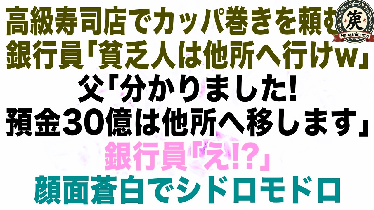 【スカッとする話】高級寿司屋で娘が大好きなカッパ巻きを頼むと隣の銀行員「貧乏人は他所へ行けw」父「分かりました!他所へ移します」→預金30億を他銀行へ移した結果【修羅場】【朗読】