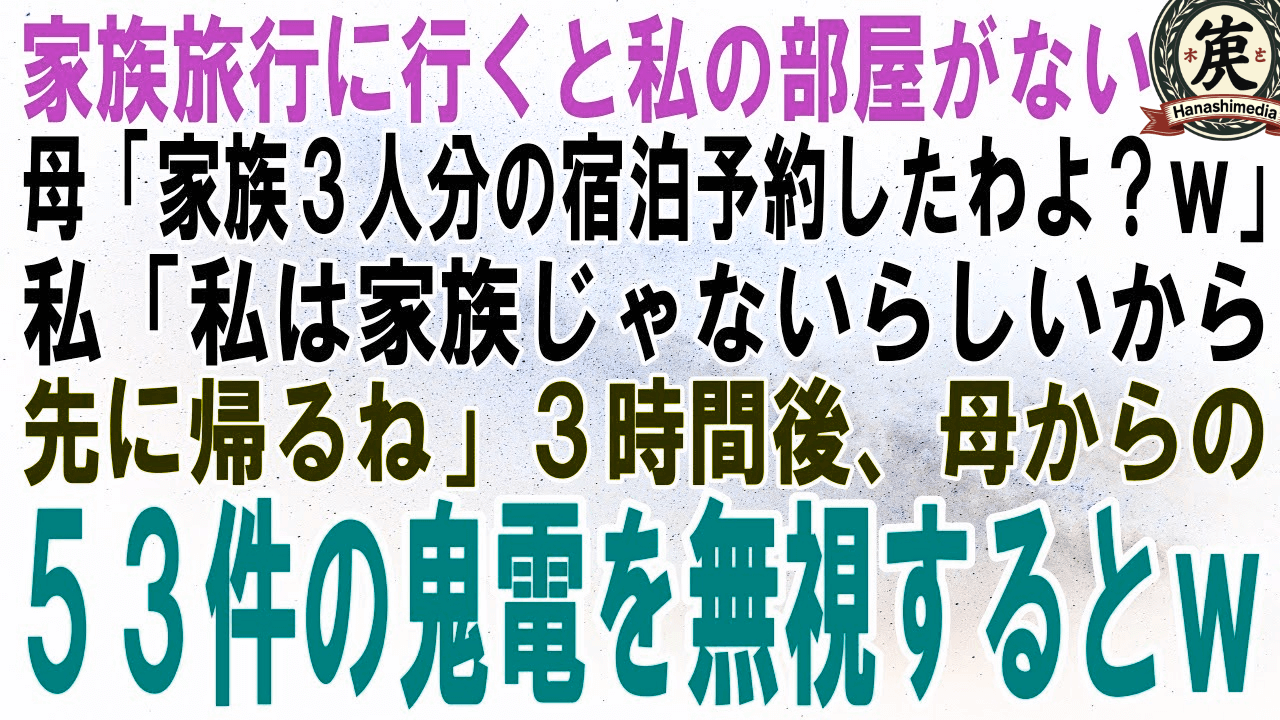 【スカッとする話】家族旅行に行くと私の部屋がない…母「私、夫、息子で家族3人分ちゃんとあるわよ?w」私「私は家族じゃないらしいから先に帰る」3時間後、母からの53件の鬼電を無視するとw【修羅場】