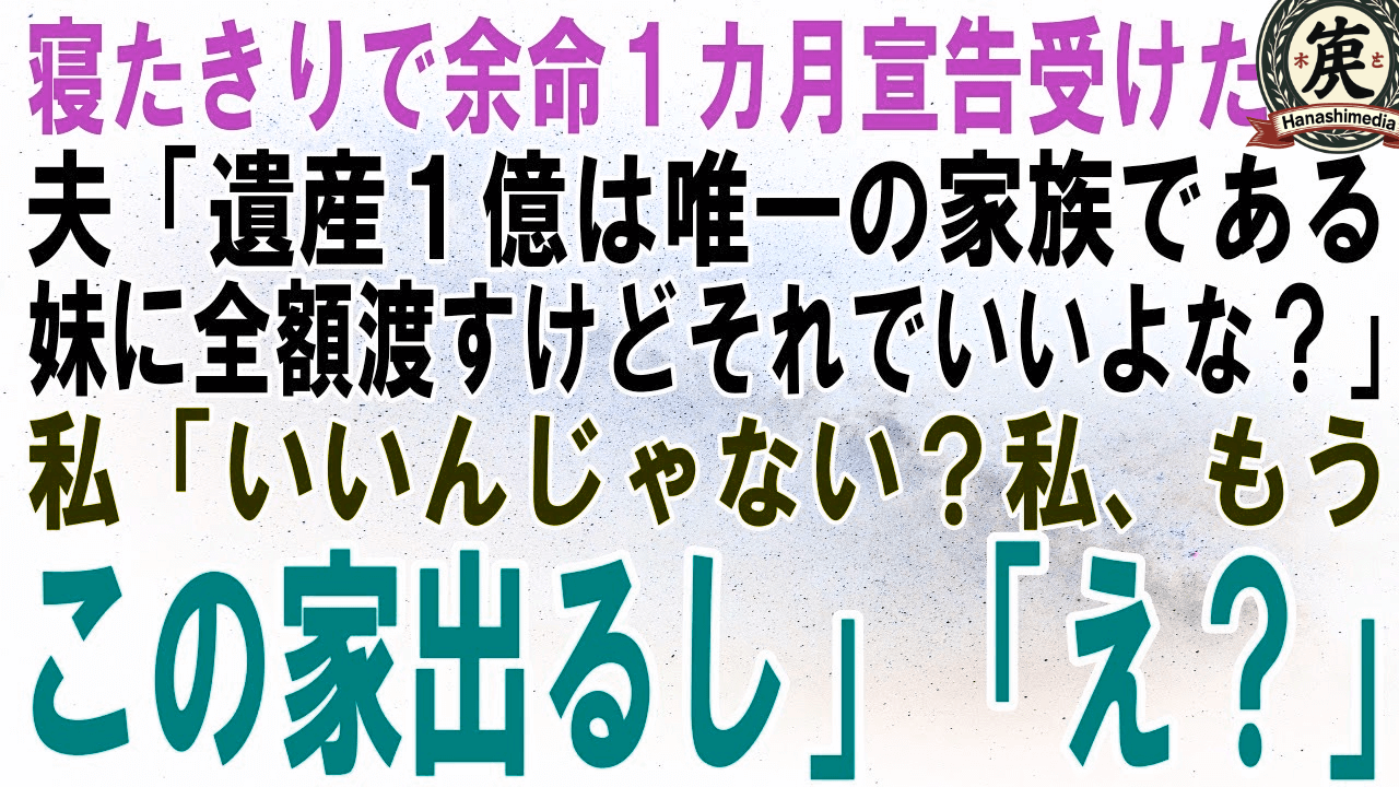 【スカッとする話】寝たきりで余命1カ月宣言受けた夫「遺産1億は唯一の家族である妹に全額残すけど文句ないよね?」私「ないわよ。私今日でこの家を出るし」夫「え?」【修羅場】