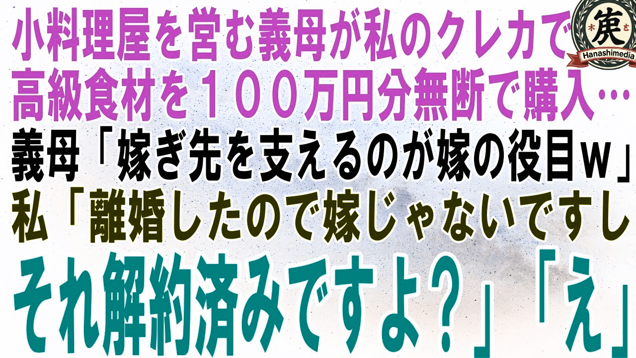 【スカッとする話】小料理屋を営む義母が私のクレカで高級食材100万円を無断購入…義母「嫁ぎ先を支えるのが嫁の役目よw」私「離婚したので嫁じゃないです。あとそのカード解約済みですよ?」「え」【修羅場】