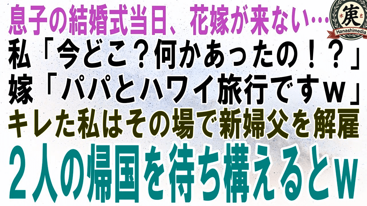 【スカッとする話】息子の結婚式当日、花嫁が来ない…私「今どこ?何かあったの!?」花嫁「パパとハワイ旅行中でーすw」キレた私は新婦父を解雇し、2人の帰国を待ち構えるとw【修羅場】