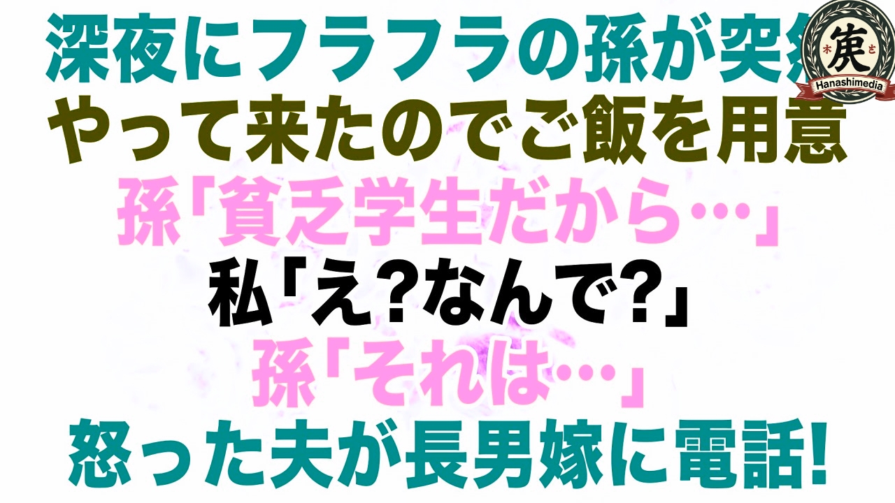 【スカッとする話】深夜にフラフラの状態で孫が突然やってきたのでご飯を食べさせた。孫「貧乏学生だから…」私「え、何故?」孫「それは…」→顔色が変わった夫が長男嫁に電話…結果【修羅場】【朗読】