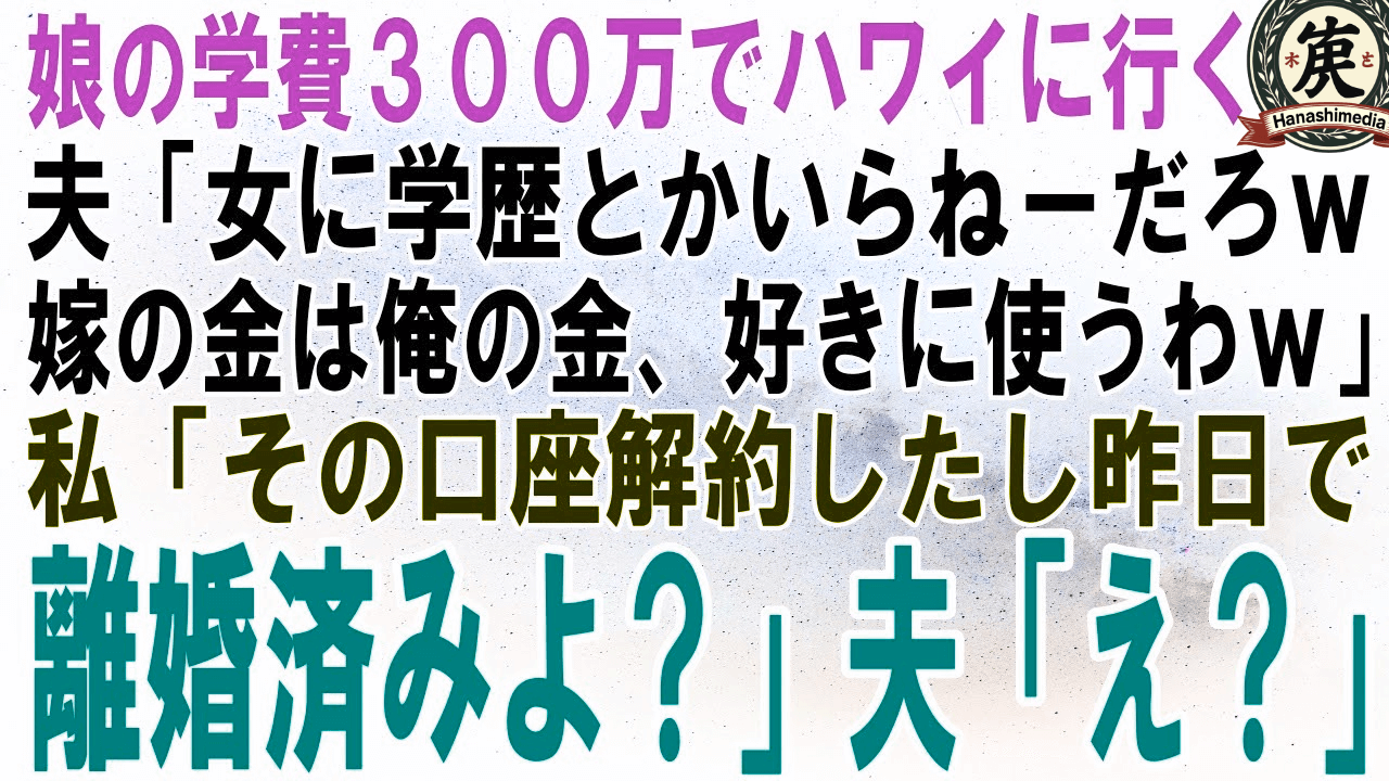 【スカッとする話】娘の大学用資金300万でハワイに行く夫「女に学歴いらねぇしいいだろw嫁の金は俺の金なんだからよw」私「その口座解約したし、昨日で離婚済みよ?」夫「え?」【修羅場】
