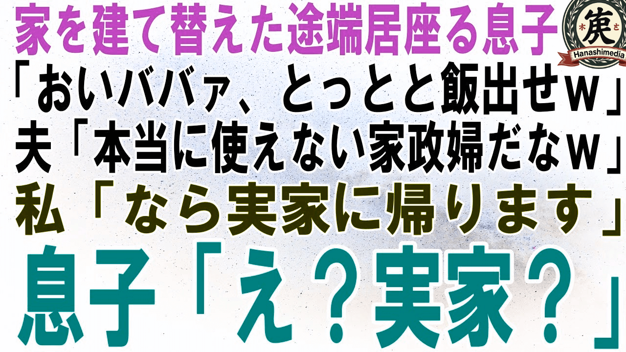 【スカッとする話】家をフルリフォームした翌日から息子夫婦が居座って2週間…息子「やっぱ孫と暮らしたいだろ?w」私「別に。お父さん置いてくから家族仲良くね」「えっ」結果w【修羅場】