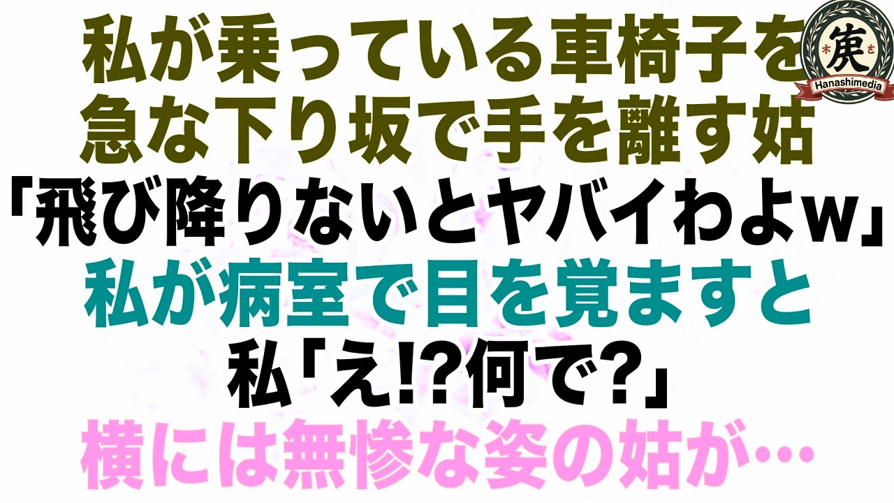 【スカッと】私ごと車椅子を急な下り坂で手を離す姑「早く脱出しないとヤバイわよw」→私が病室で目を覚ますと横には無惨な姿の姑が…【修羅場】【朗読】