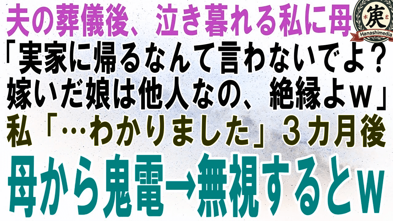 【スカッとする話】夫の葬儀後、泣き崩れる私に母「旦那が〇んだからって帰って来ないでよ?嫁いだ娘はもう他人なの、一生絶縁よw」私「…はい」3カ月後、母から鬼電→徹底的に無視するとw【修羅場】