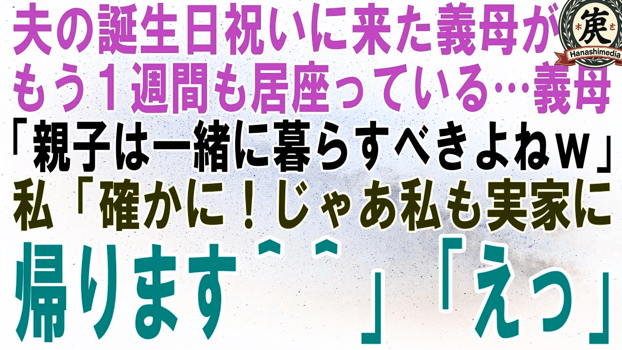 【スカッとする話】夫の誕生祝に来た義母がもう1週間も居座ってる…義母「やっぱり親子は一緒に暮らすべきだと思うわw」私「ですよね!だから私も実家に帰ります^^」義母「えっ」【修羅場】