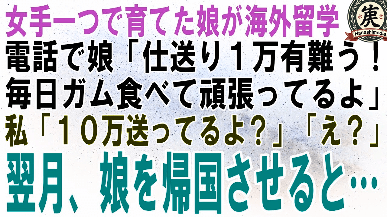 【スカッとする話】女手一つで育てた娘が海外留学。電話で娘「仕送り1万有難う!毎日ガム食べて頑張ってるよ」私「毎月10万送ってるよ?」娘「え?」翌月、娘を帰国させると…【修羅場】