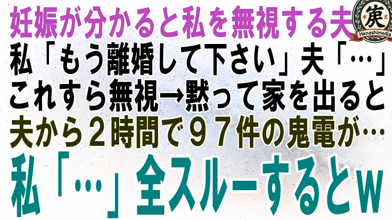 【スカッとする話】妊娠報告すると私を無視し始めた夫。私「もう限界、離婚して!」夫「…」これすら無視されたので黙って家を出ると、夫から2時間で97件の鬼電が…私「…」全スルーした結果w【修羅場】