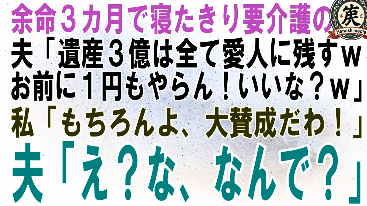 【スカッとする話】余命3カ月で寝たきり要介護の夫「遺産3億は全て愛人に残す。お前には1銭もやらん!いいな?w」私「もちろんよ、大賛成!」夫「え、え?何で?」実はw【修羅場】