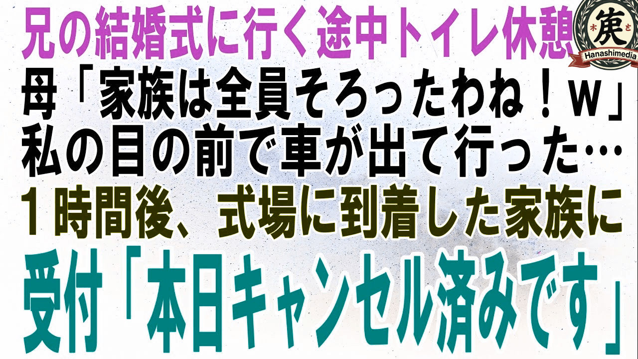【スカッとする話】兄の結婚式に行く途中トイレ休憩すると母「家族は全員そろったわね!w」私の目の前で車が発車…。1時間後、式場に到着した家族に受付「本日キャンセル済みです」【修羅場】