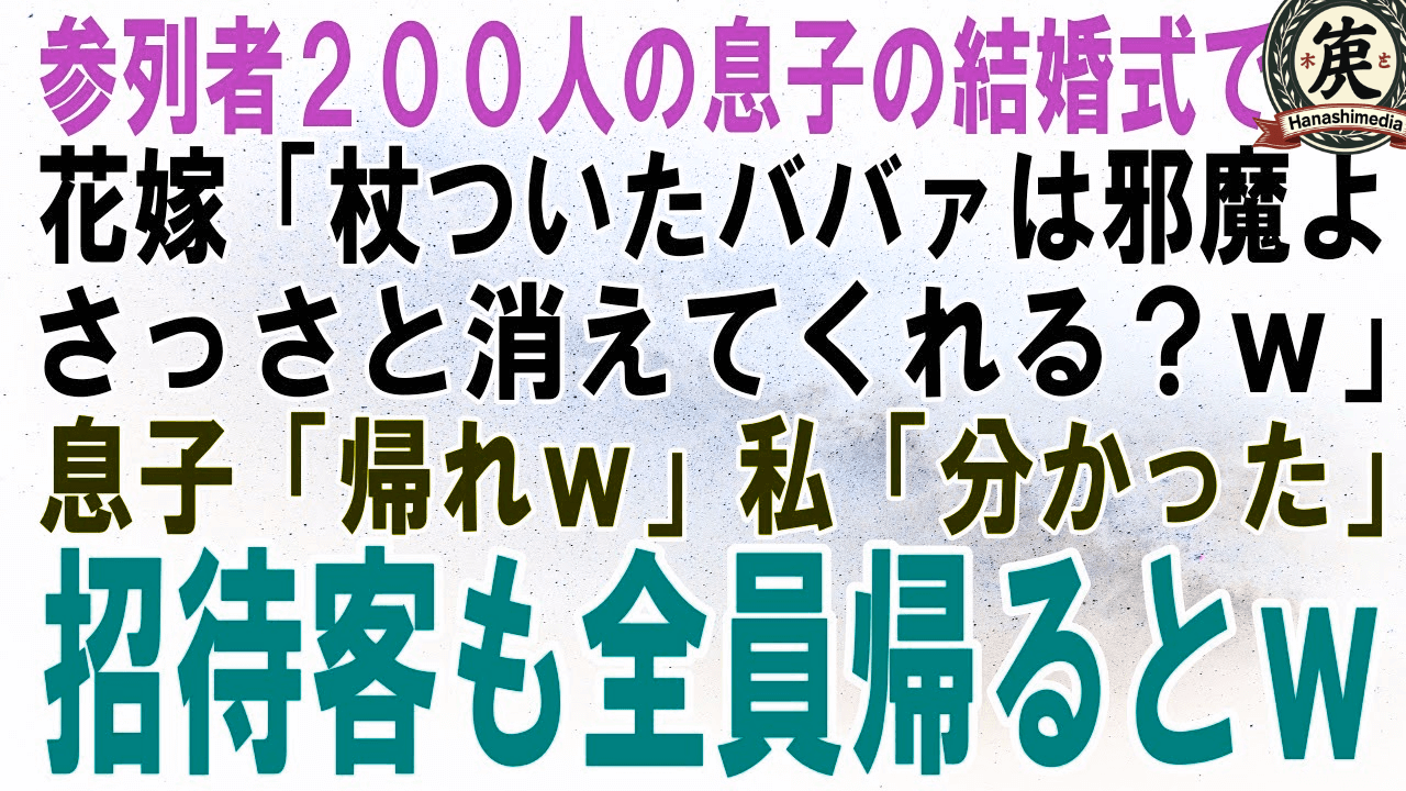 【スカッとする話】参列者200人の息子の結婚式で花嫁「杖ついたババァは邪魔!さっさと消えてくれる?w」息子「そうだそうだw」私「分かった」招待客も全員帰るとw【修羅場】