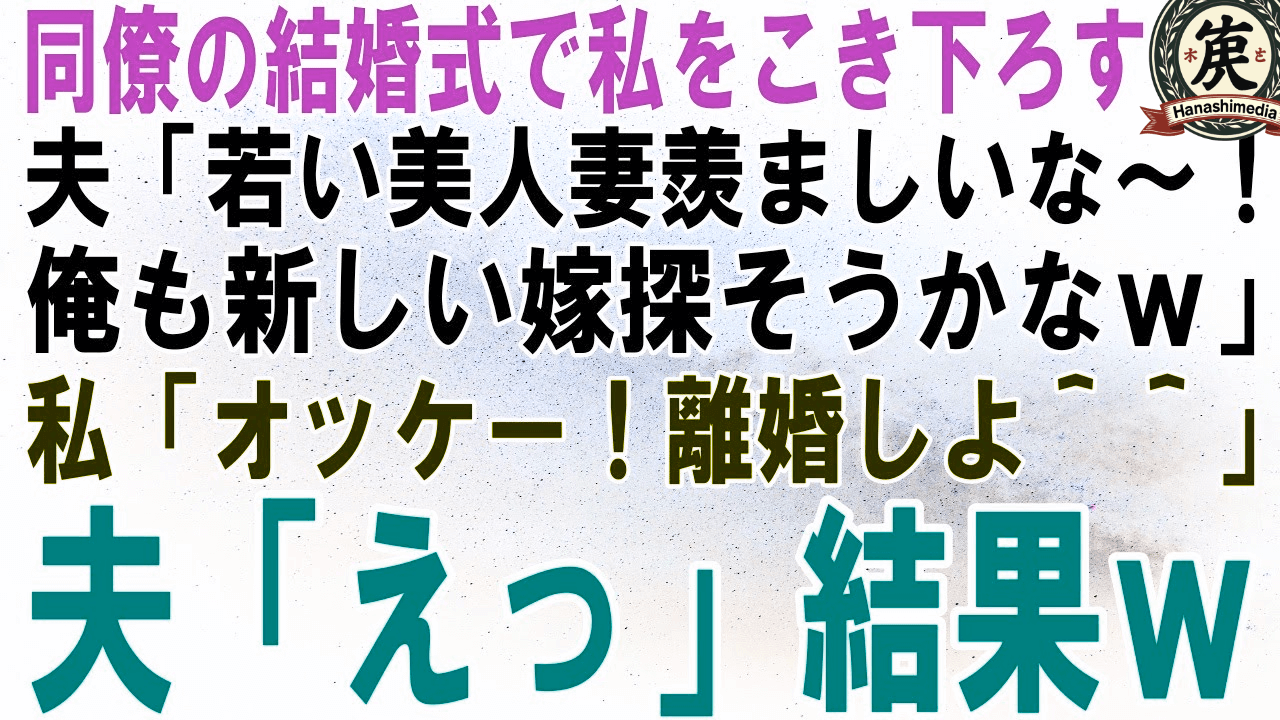 【スカッとする話】同僚の結婚式で私をこき下ろす夫「お前の嫁は若くて美人で羨ましい!俺も新しい嫁探そうかなw」私「オッケー!じゃあ離婚で」夫「えっ」結果w【修羅場】