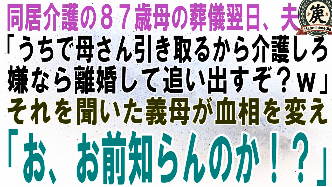 【スカッとする話】同居介護した87歳母の葬儀翌日、夫「次は母さんの介護よろしくw嫌なら離婚して追い出すが?w」それを聞いた義母が血相を変え「お、お前知らんのか!?」「え?」【修羅場】