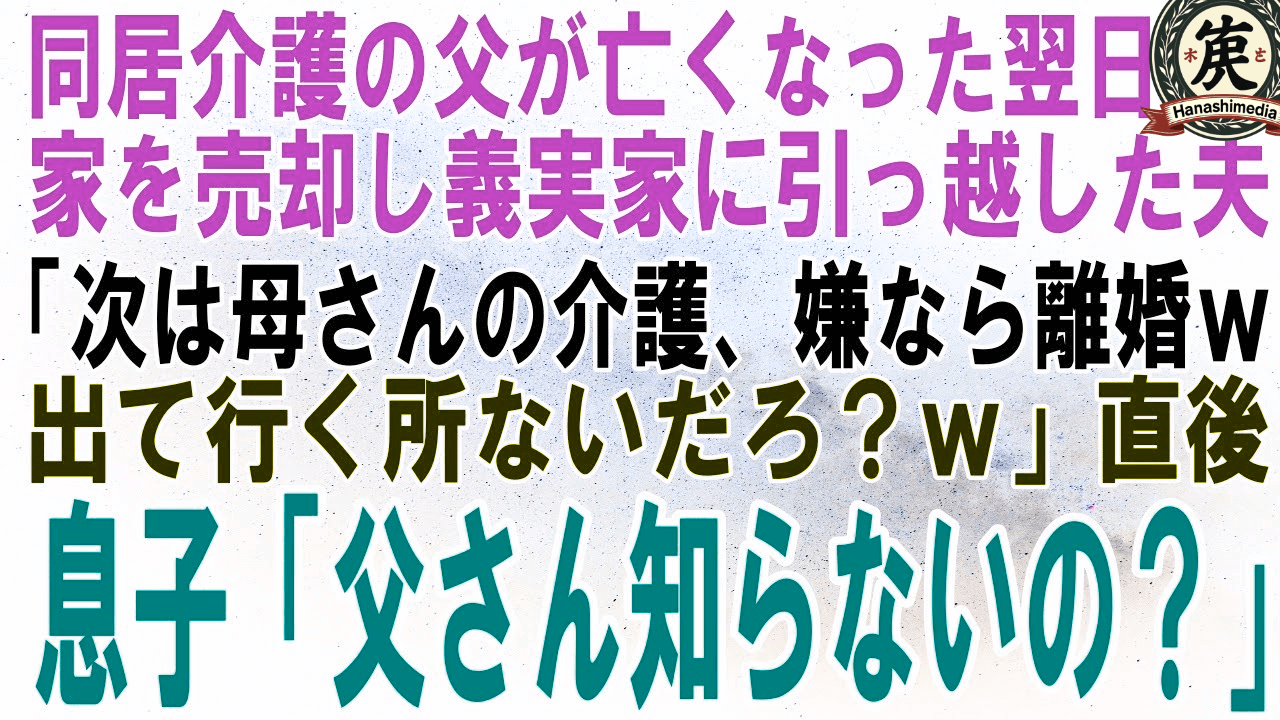 【スカッとする話】同居介護の父が亡くなった翌日、自宅を売却し義実家に引っ越した夫「次は母さんの介護な!嫌なら離婚だが、家はもうないのに出て行く所あるか?w」直後、息子「父さん知らないの?」【修羅場】
