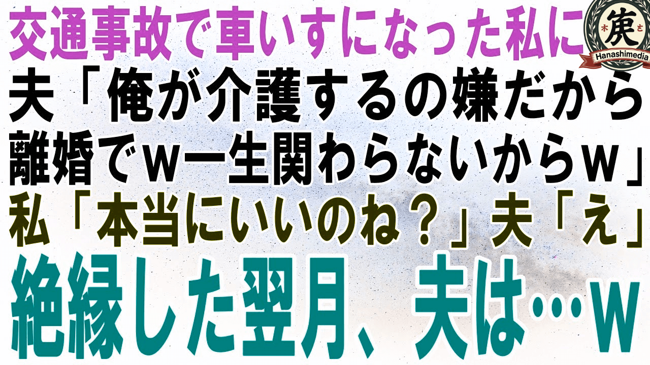 【スカッとする話】夫のせいで車いす生活になった私に夫「年増の介護なんて嫌w離婚だ、一生連絡するなw」私「そう。後悔しないでね」夫「誰がするかw」結果w【修羅場】