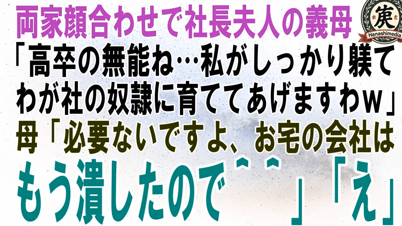 【スカッとする話】両家顔合わせで社長夫人の義母「高卒の無能が嫁ねぇ…私がしっかり躾てわが社の戦力に育ててあげるますわw」母「ご安心を。お宅の会社はもう潰れたので^^」「え?」【修羅場】