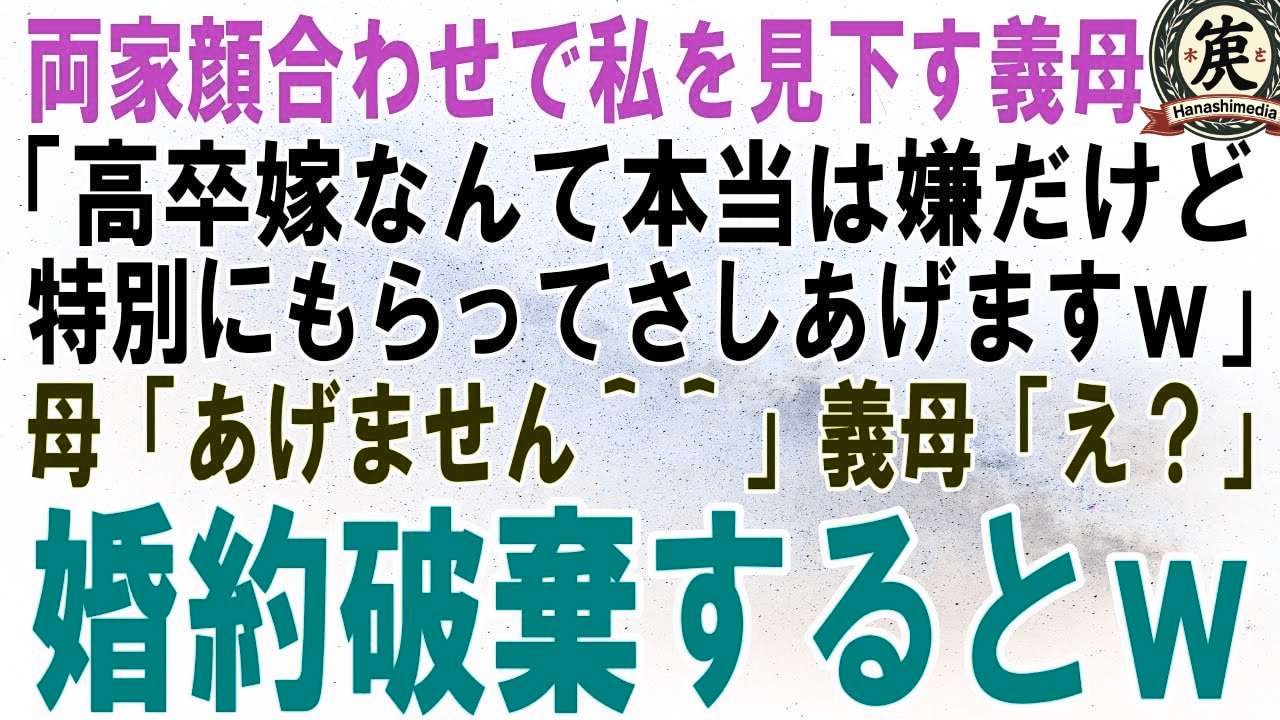 【スカッとする話】両家顔合わせで私を見下す義母「高卒の嫁なんて本当は嫌だけど特別にもらってさしあげますわw」私「…」母「あげません^^」義母・私「え?」結果w【修羅場】