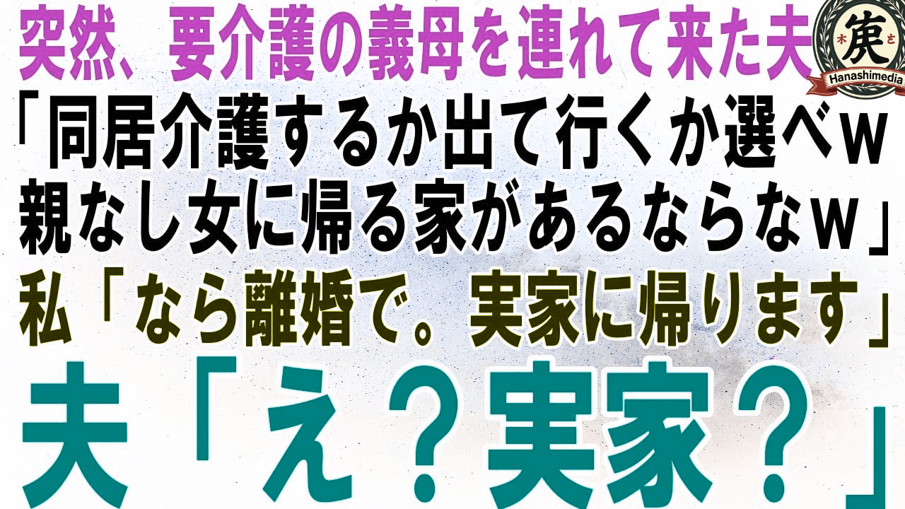 【スカッとする話】ある日突然、要介護の義母を連れて来た夫「同居介護するか出て行くか選べw親なし女に帰る家があるならなw」私「なら離婚で。実家に帰ります」夫「え?実家?」【修羅場】.mp4