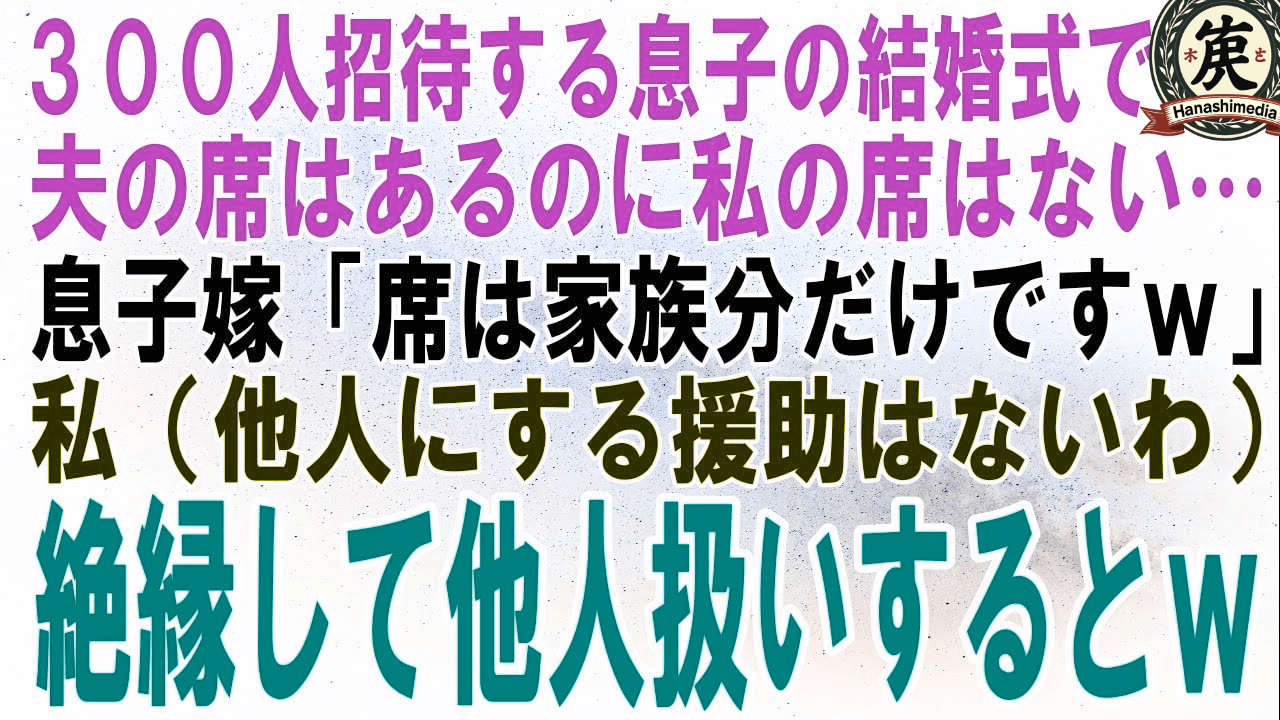 【スカッとする話】300人招待する息子の結婚式で夫の席はあるのに私の席はない…息子嫁「席は家族分だけですけどw」私(援助は全部やめるか…)絶縁して他人扱いするとw【修羅場