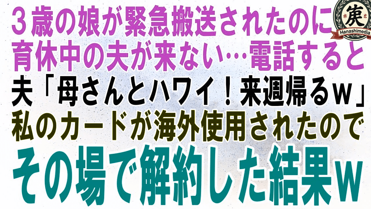 【スカッとする話】3歳の娘が緊急搬送されたのに育休中の夫が来ない。電話すると夫「母さんとハワイ!来週帰るわw」私宛てにクレカの請求が来たのでその場でカード解約した結果w【修羅場】