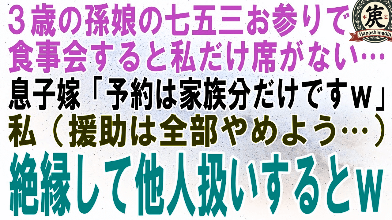 【スカッとする話】3歳の孫娘の七五三お参りで食事会すると私だけ門前払いされた…息子嫁「予約は家族分だけですよw」私(援助は全部やめよう…)絶縁して他人扱いするとw【修羅場】