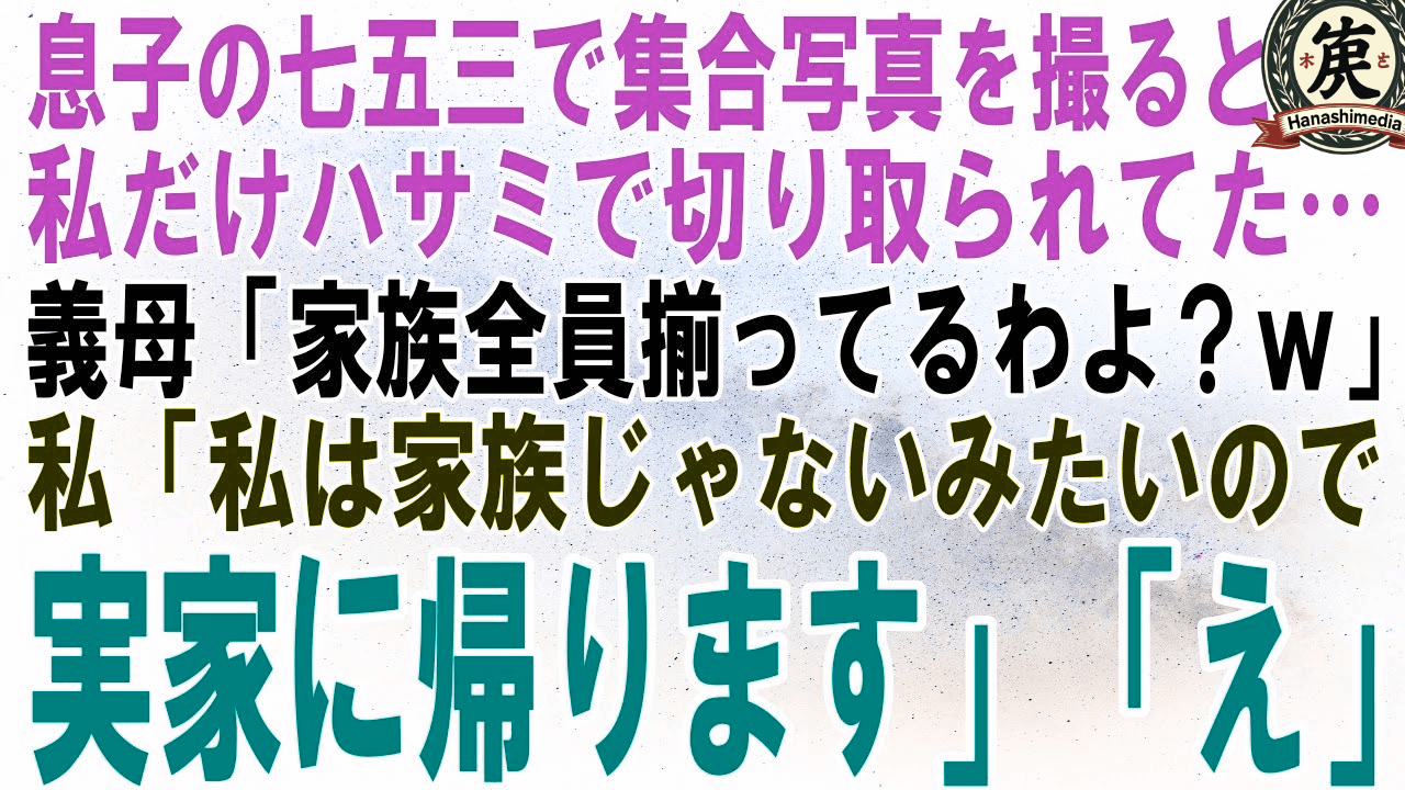【スカッとする話】息子の七五三で集合写真を撮ると私だけハサミで切り取られてた…義母「何かおかしい?家族全員揃ってるわよw」私「私は家族じゃないみたいなので実家に帰ります」「え」【修羅場】