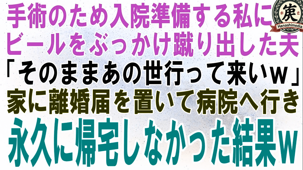 【スカッとする話】手術のため入院準備する私にビールをぶっかけ蹴り出した夫「そのままあの世行って来いw」家に離婚届を置いて病院へ行き、永久に帰宅しなかった結果w【修羅場】