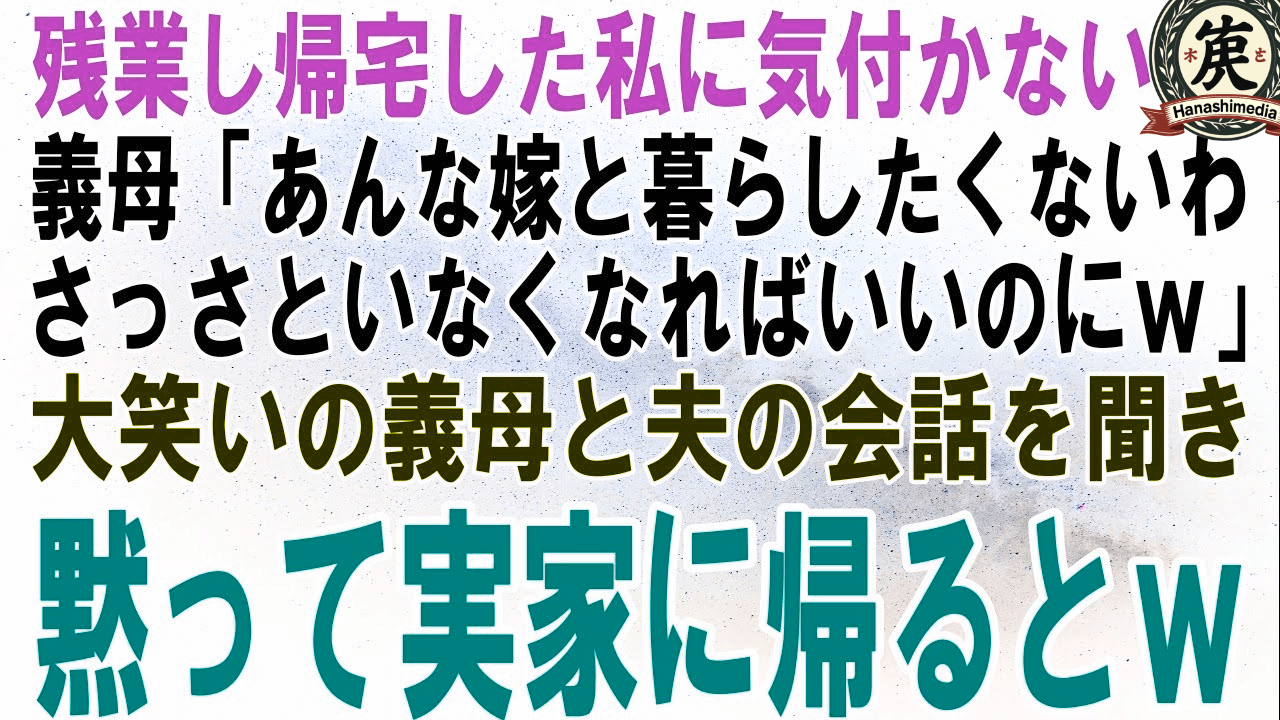 【スカッとする話】残業から帰宅した私に気付かない義母「あんな嫁と一緒に暮らしたくないわ、さっさといなくなればいいのにw」大笑いの義母と夫の会話を聞いた私が黙って実家に帰るとw【修羅場】